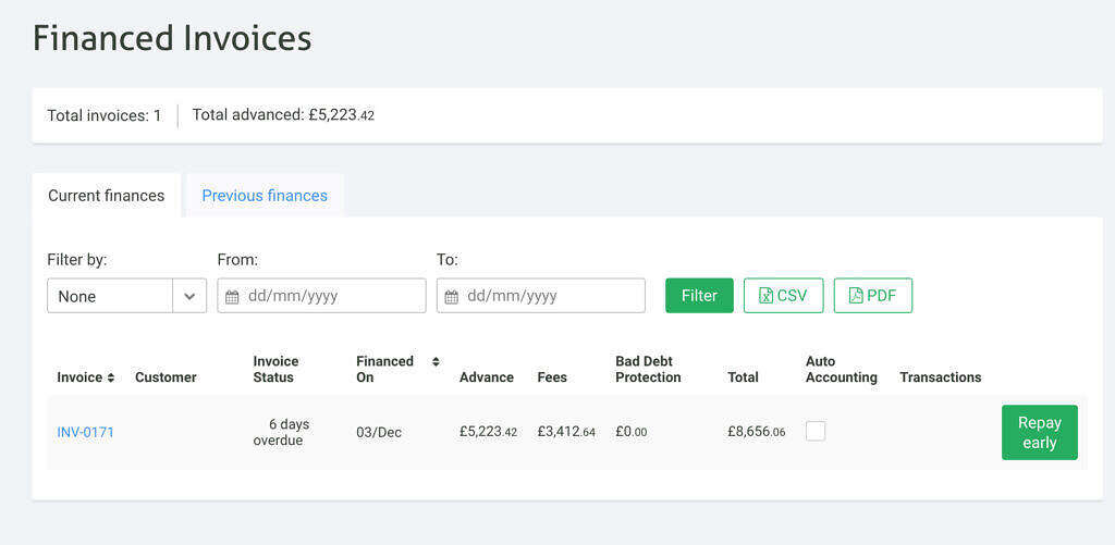 - Financed invoices: This screen shows historic data about past invoices the SME has had finance against.